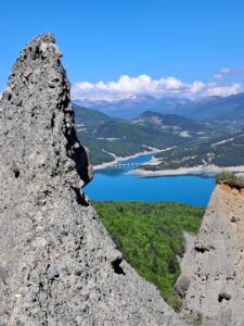 Mi Jo avait prévu un endroit non loin du village de Pontis pour y manger. Certains se sont installés à l’ombre, d’autres au soleil, selon les préférences de chacun. Après une brève visite du village de Pontis, on a repris la montée vers le col de Pontis. Sur le goudron, c’est vrai, mais il n’y avait pas d’autre alternative. La chaleur et l’effort nous ont souvent forcés à faire des pauses. Et à chaque arrêt, une belle récompense : une vue imprenable sur le lac de Serre-Ponçon.
