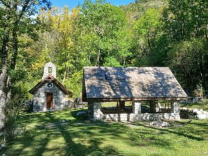 En peu de temps, nous rejoignons la Baisse de Bordette à 1520 m d'altitude pour redescendre à travers une très belle forêt vers le torrent du Galèbre, très sage aujourd'hui, mais qui peut s'avérer tempétueux lors de ses crues. L'ambiance dans le groupe est au beau fixe et les conversations fusent et abordent de multiples sujets mais par dessus tout, l'ensemble des marcheurs s'accorde à souligner la beauté de cet environnement préservé et son sublime isolement. C'est aussi l'occasion pour certains amateurs de s'adonner à la cueillette des champignons, nombreux dans ce secteur. Après avoir traversé le torrent, nous atteignons Pié Fourcha dans une belle et douce clairière baignée de lumière, où se nichent une chapelle et un abri récemment restaurés, l'occasion pour nous de faire une petite pause et de nous restaurer.