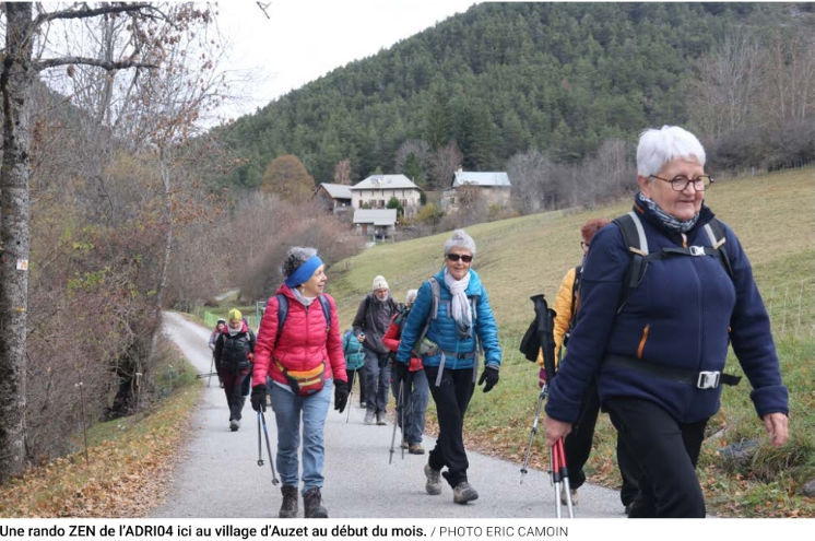 L’ADRI04, association historique de randonnées dans le pays dignois, a bien compris qu’il ne s’agissait pas simplement d’enfiler des chaussures et de gravir les sommets alentour. Depuis plusieurs années, elle propose des activités variées pour inclure le plus grand nombre d’amateurs et d’amatrices de randonnées. Les randonnées en silence en sont un exemple. "Le silence crée du lien avec les personnes qui sont autour, résume Martine. La marche lente permet de mieux dérouler son pas, de prendre le temps, d’écouter l’environnement, ses propres pas sur le sol. L’idée est de marcher avec la nature et non dans la nature."...